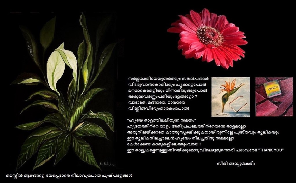 “കൊടും കാറ്റിനേയും അലറും തിരകളേയുംതടയുമഗ്നിയായ് മാറുമീ ഹൃദയംആഴും നിദ്രയിലൊഴുകി ഞാനമ്മതൻമൃദുകര സ്പർശനമേൽക്കുന്ന തീരംഹൃദയ താളത്തിലലിയുന്ന സമയം…” Share this: Click to share on X (Opens in new window) X Click to share on Facebook (Opens in new window) Facebook Like Loading... Related Leave a comment Cancel reply Δ